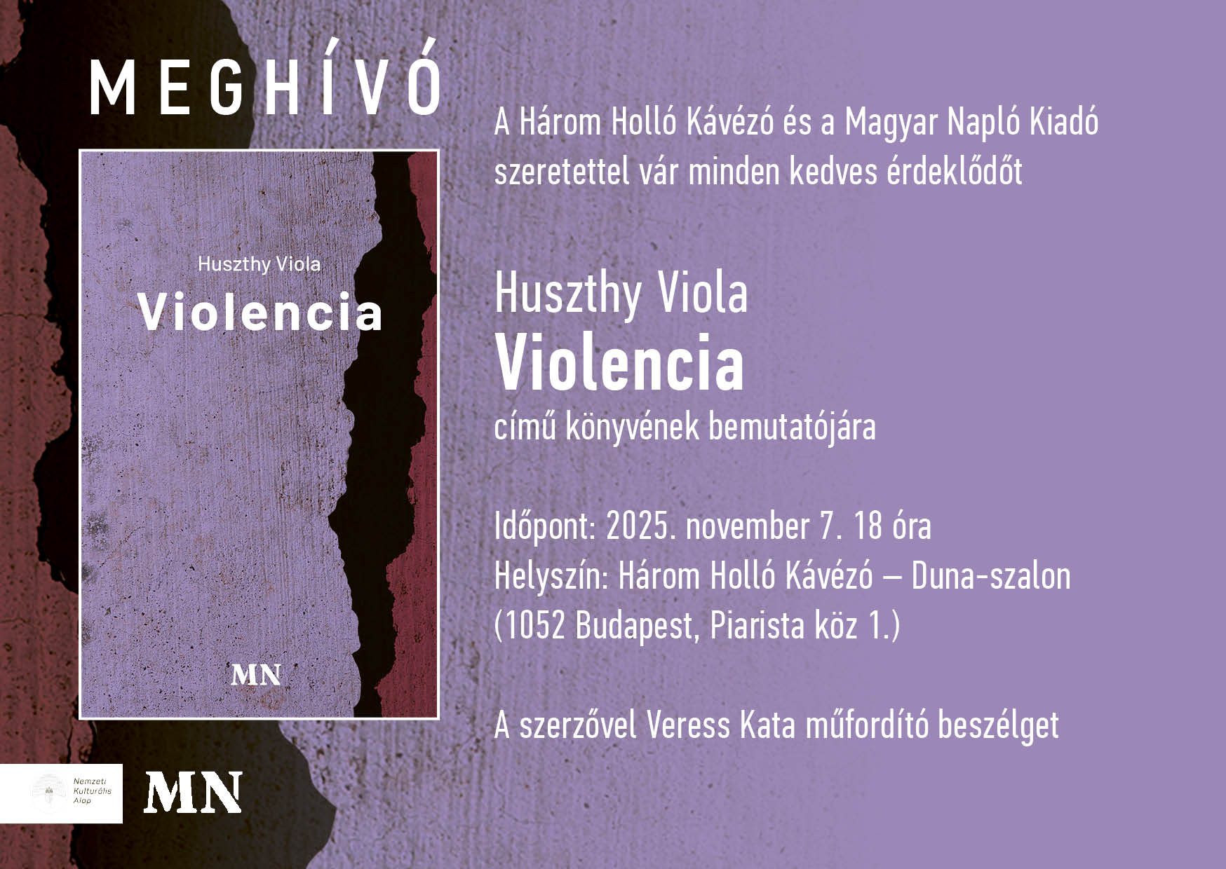 Megosztás Facebook Twitter Linkedin URL másolása Könyvbemutató - Huszthy Viola: Violencia Dátum 2025. november 07., 18:00 – 19:00 Helyszín Három Holló Kávézó (1052 Budapest, Piarista köz 1. A Három Holló Kávézó és a Magyar Napló Kiadó sdzeretettel vár minden kedves érdeklődőt Huszthy Viola: Violencia című kötetének bemutatójára. A szerzővel Veress Kata műfordító beszélget. További események Könyvbemutató - Jale Trana Elhadef: Ez is Pest Oláh János Emlékest és díjátadó 2025 Könyvbemutató - Léka Géza: Egérutak a kimért sorsból Teljes lista