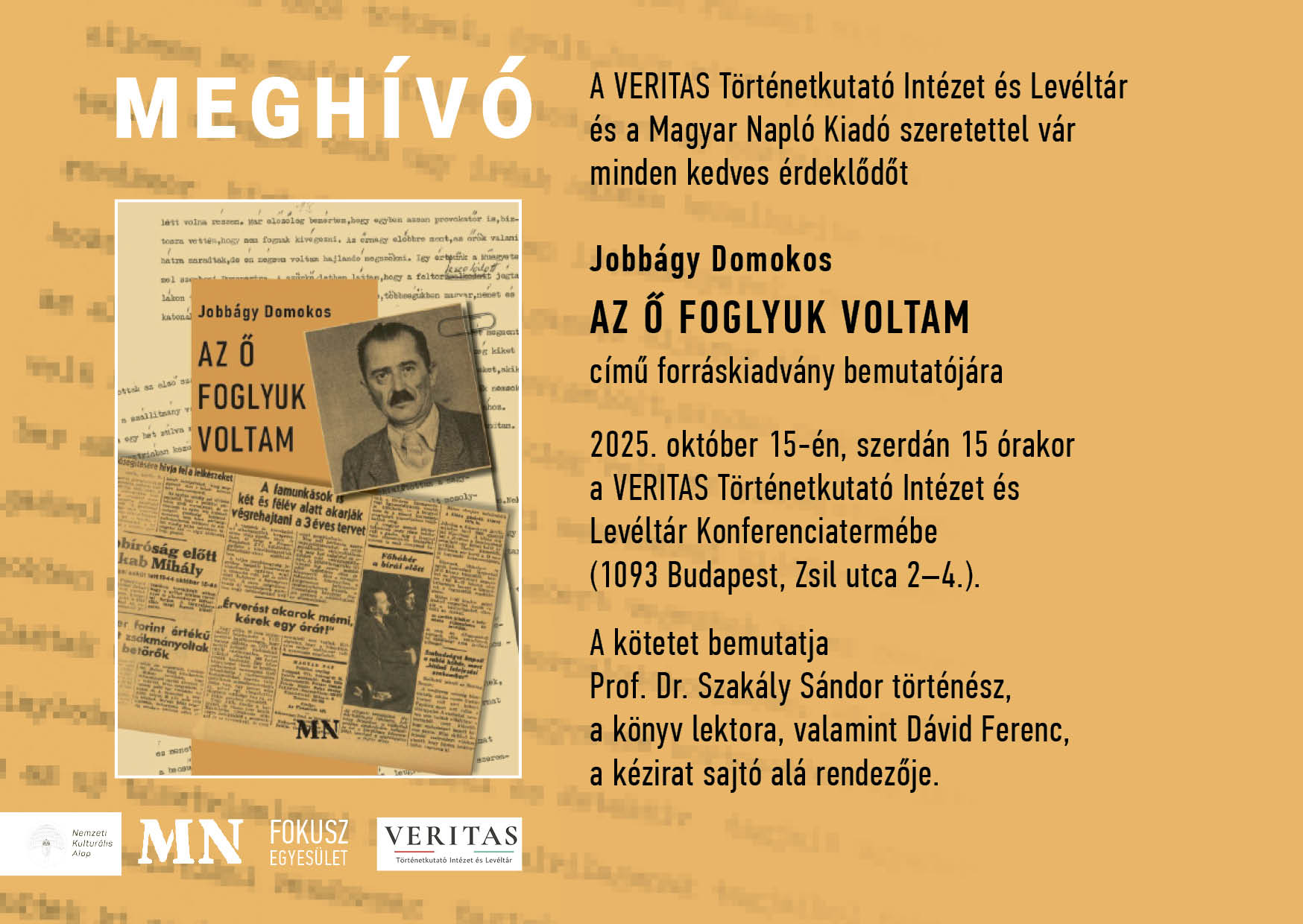 Megosztás Facebook Twitter Linkedin URL másolása Könyvbemutató: Jobbágy Domokos: Az ő foglyuk voltam Dátum 2025. október 15., 15:00 – 16:00 Helyszín VERITAS Történetkutató Intézet és Levéltár Konferenciatermébe (1093 Budapest, Zsil utca 2–4.) További események Könyvbemutató - Majoros Sándor: Kiforogta a szó Könyvbemutató - Jezsó Ákos: Éjfélre kialszanak a lángok Könyvbemutató - Nyilasy Balázs: Elvek és szavak próbája Teljes lista