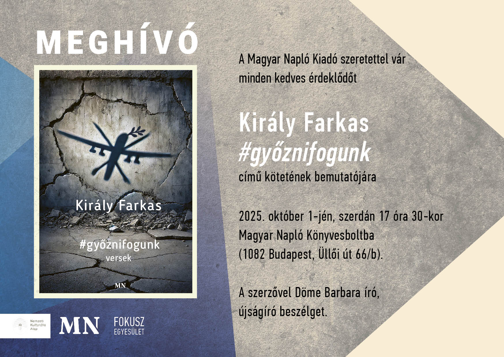 Megosztás Facebook Twitter Linkedin URL másolása Könyvbemutató - Király Farkas: #győznifogunk Dátum 2025. október 01., 17:30 – 18:30 Helyszín Magyar Napló Könyvesbolt (1082 Budapest, Üllői út 66/b.) További események Könyvbemutató - Jezsó Ákos: Éjfélre kialszanak a lángok Könyvbemutató: Jobbágy Domokos: Az ő foglyuk voltam Könyvbemutató - Nyilasy Balázs: Elvek és szavak próbája Teljes lista
