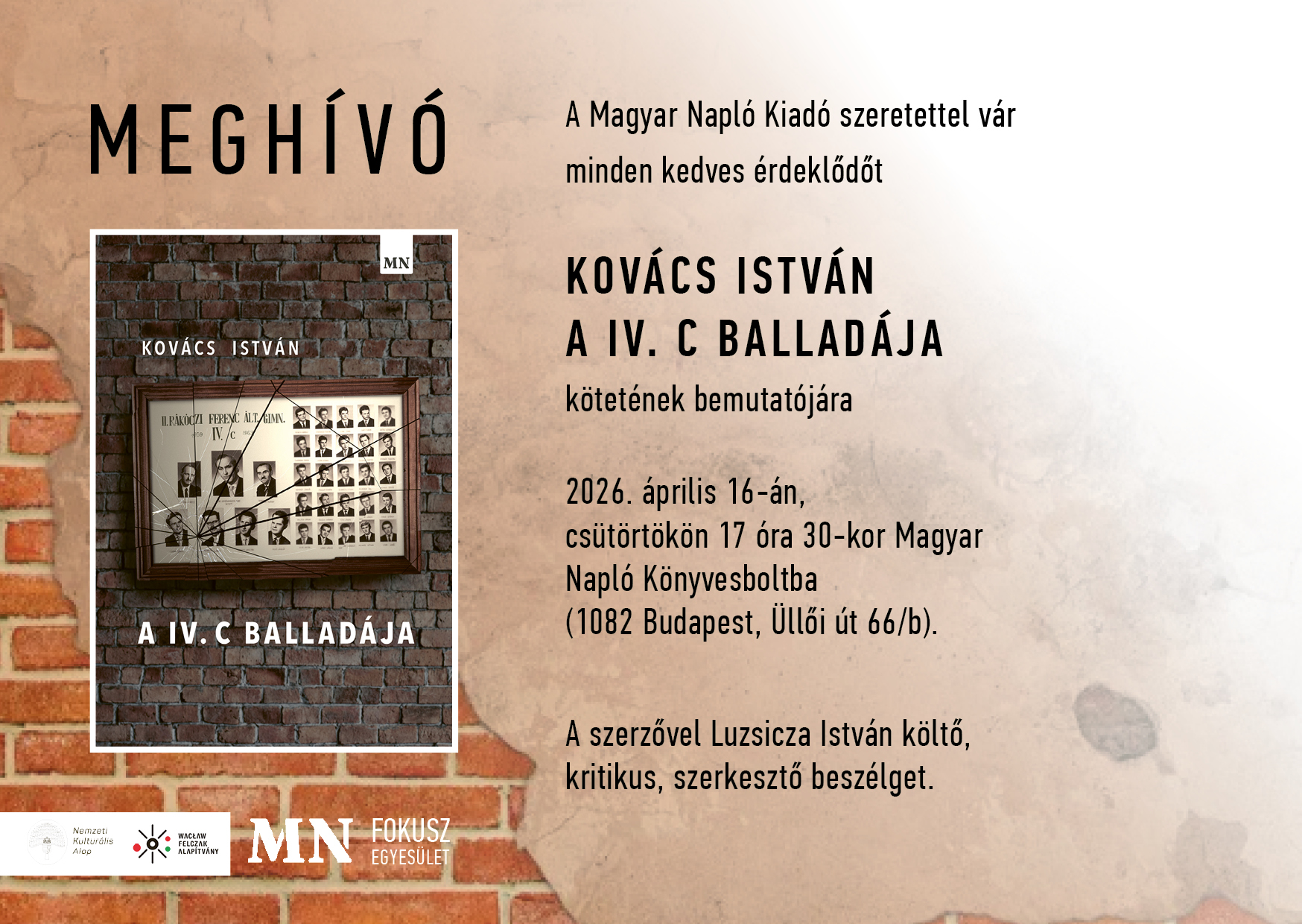Megosztás Facebook Twitter Linkedin URL másolása Könyvbemutató - Kovács István: A IV. c balladája Dátum 2026. április 16., 17:30 – 18:30 Helyszín Magyar Napló Könyvesbolt (1082 Budapest, Üllői út 66/b.) További események Könyvbemutató - Jale Trana Elhadef: Ez is Pest Könyvbemutató - Iancu Laura: Visszaaludni nem tudtam Prózamaraton 2026 Teljes lista