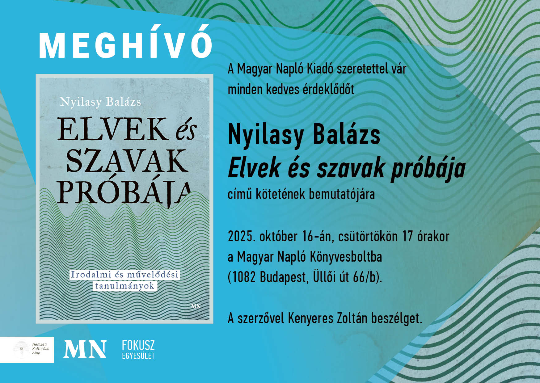 Megosztás Facebook Twitter Linkedin URL másolása Könyvbemutató - Nyilasy Balázs: Elvek és szavak próbája Dátum 2025. október 16., 17:00 – 18:00 Helyszín Magyar Napló Könyvesbolt (1082 Budapest, Üllői út 66/b.) További események Könyvbemutató - Majoros Sándor: Kiforogta a szó Könyvbemutató - Jezsó Ákos: Éjfélre kialszanak a lángok Könyvbemutató: Jobbágy Domokos: Az ő foglyuk voltam Teljes lista