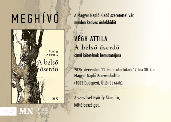 Megosztás Facebook Twitter Linkedin URL másolása Könyvbemutató - Végh Attila: A belső őserdő Dátum 2025. december 11., 17:30 – 18:30 Helyszín Magyar Napló Könyvesbolt (1082 Budapest, Üllői út 66/b.) További események Könyvbemutató - Tóth László: Időző Könyvbemutató - Árkossy István: Farkasok utcája Könyvbemutató - Jale Trana Elhadef: Ez is Pest Teljes lista